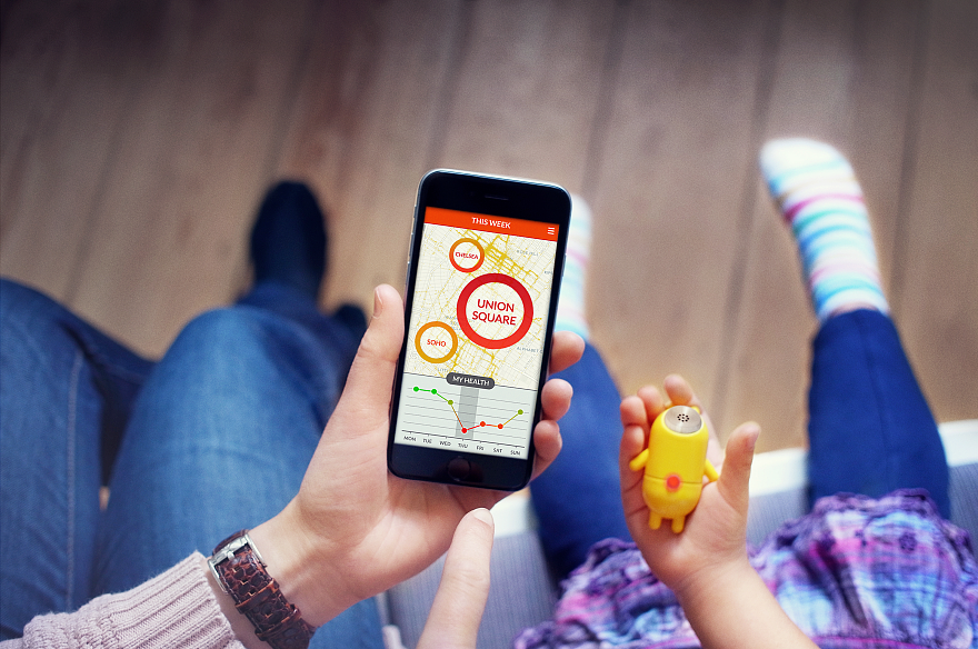 这是一款能够检测到空气污染程度的感应器,它一旦暴露在空气中,就会将检测结果发送至链接的手机App上。红色信号灯点亮说明小黄人病了,周围空气受到一定的污染。连接的手机App会告诉你,空气的污染情况以及解决方案。